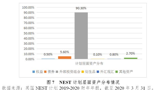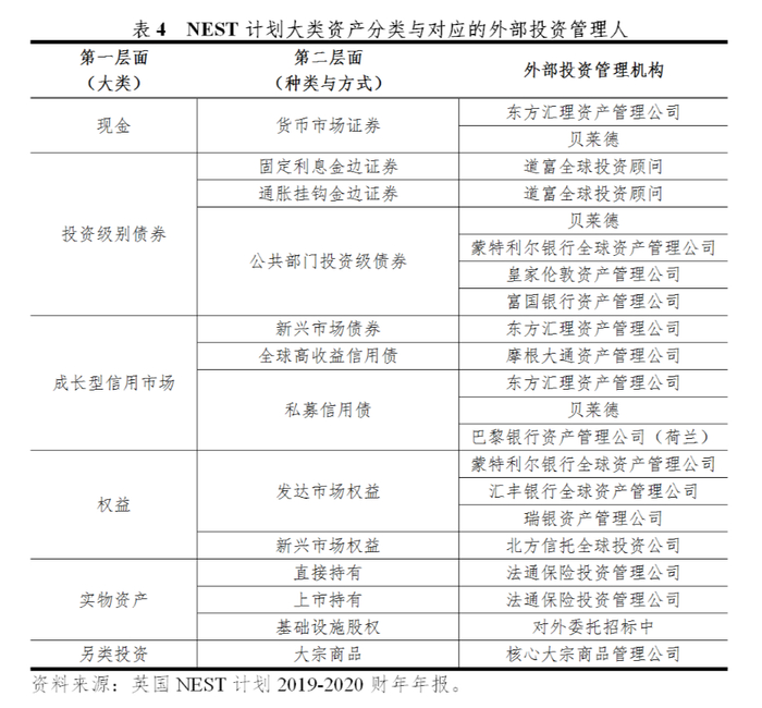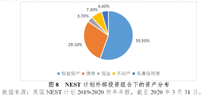 由于NEST计划采用了FOF与MOM相结合的投资结构,因此绝大部分计划资产均配置于外部投资管理机构开设的投资组合之中,截至2020年3月底,配置于外部投资组合的资产规模为87.2亿英镑,占计划投资资产的90.3%。同时,NEST公司按照投资产品的既定策略,通过外部投资组合实现了计划资产的大类资产配置,截至2020年3月底,外部投资组合的资产中,有55.5%配置于权益资产、29.1%配置于债券、3.7%配置于现金、7.3%配置于不动产、4.4%配置于私募信用债。
