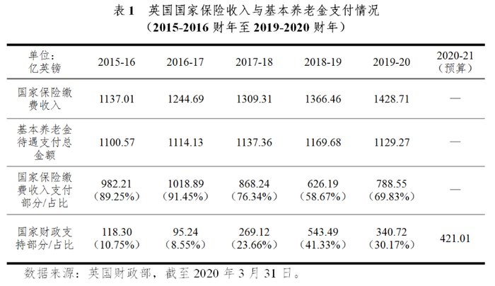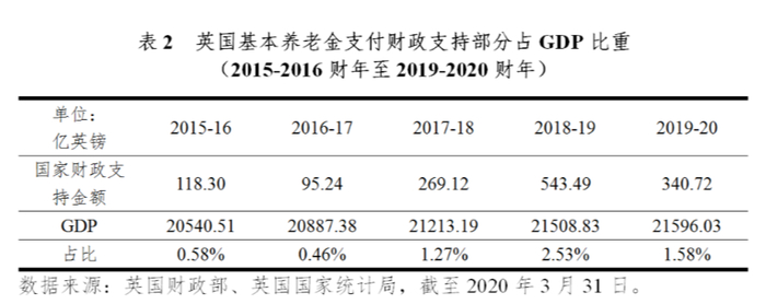 英国基本养老金施行现收现付制度,由英国就业与养老金部制定参与、领取规则,由英国财政部负责基本养老金的财务收支,每期支付的养老金来源于当期的国家保险缴费收入和政府税收收入。英国国家保险是在英国具有正式工作的居民必须参加的社会保障制度,由雇主与个人共同缴纳费用,以此获得享受基本养老金、失业救济、亲人死亡补助、孕期补助等相关社会福利的权利。从2015-2016财年至2019-2020财年的数据来看,英国基本养老金每年度支付金额大部分来自于当年国家保险的缴费收入,不过在2018-2019财年和2019-2020财年,国家保险缴费收入在支付金额中的占比有所下降,政府加大了财政的支持力度,并在2020-2021财年给予了超400亿英镑的财政预算用于基本养老金的待遇支付。经济层面看,自2015-2016财年开始,英国基本养老金支付金额中财政支持部分占GDP的比重整体呈上升趋势,从2015-2016财年的0.58%增长至2019-2020财年的1.58%。