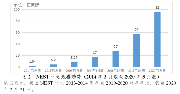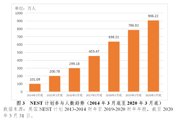 得益于“自动加入”机制的实施,英国NEST计划在成立后发展迅速。在2014年3月底,仅有101.09万人参加NEST计划,计划规模也只有1亿英镑;而到了2020年3月底,已有80.3万家企业和906.22万人加入NEST计划,计划资产管理规模合计为95亿英镑。