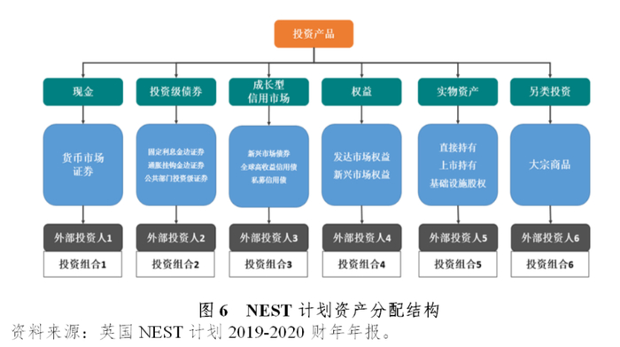 NEST计划主要采用以“产品+对外委托”的管理方式,NEST公司针对计划参与雇主与雇员设计了不同的投资产品,通过投资产品募集缴费资金后将计划资产的绝大部分委托给外部投资管理人进行投资管理,充分利用市场的投资能力为计划资产进行长期投资。NEST计划资产的投资管理分为两个层面,第一个层面是计划参与个人将缴费资金投资于NEST提供的投资产品(投资组合),第二个层面是NEST将投资产品(投资组合)中的资金进行投资管理,实现养老资金的长期增值。