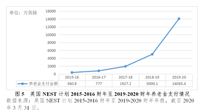 随着时间的推移,NEST计划中达到退休年龄的人数逐渐增加,养老金的领取规模也随之逐年递增,NEST计划每年支付的养老金规模已从2015-2016财年的360.8万英镑迅速增长至2019-2020财年的1.4亿英镑。虽然养老金支付规模提升较快,但现阶段NEST计划每年获得的资金收入规模远超过支付规模,且由于采用信托结构并实行个人账户积累制,NEST计划并不会发生计划资产无法支撑养老金支付的情况。