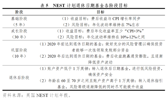 为了满足计划参与个人不同的风险偏好、投资需求与年龄特征,NEST构建了“1+6”的产品系列供投资者进行选择,同时设置了默认投资机制以确保计划参与个人账户内的资金得到充分合理的投资管理,获取足够的长期增值。“1”代表退休日期基金,是一种与参与个人年龄相匹配的投资产品,也是NEST计划的默认投资选项。“6”代表除退休日期基金外,NEST提供的另外6只投资产品,分别为退休指引基金、道德基金、伊斯兰基金、高风险基金、临退休基金和低成长基金,用于满足具有特殊风险要求、道德标准、宗教信仰人群的养老金投资管理需求。