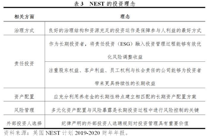 NEST公司专门制定了《NEST投资准则》(Statement of Investment Principles,SIP),以确保NEST计划资产在投资管理过程中有规可循。《NEST投资准则》对NEST公司如何管理计划资产提供了详细的指引且每三年更新一次,根据最新的投资准则,NEST计划在2020年至2023年期间的主要投资目标是获取能够长期跑赢通货膨胀的投资收益。同时,NEST公司从治理方式、责任投资、资产配置、风险管理、外部投资人选择等多个方面形成了科学的投资理念,注重计划参与者的核心利益、关注责任投资的重要作用、坚信长期投资与多元化配置、遵循纪律严明的外部投资人选聘规则。