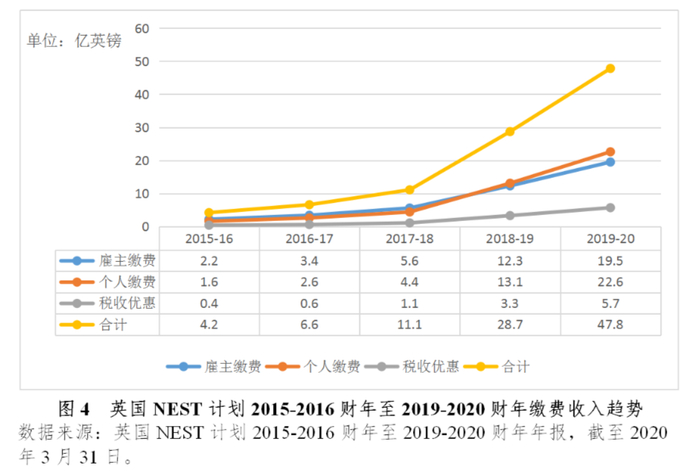 在2015-2016财年至2019-2020财年期间,NEST计划每年的资金缴费收入从4.2亿英镑快速增长至47.8亿英镑,同时个人参与计划及缴费的积极性也越发强烈,个人年度缴费规模从2018-2019财年开始已超过雇主年度缴费规模。