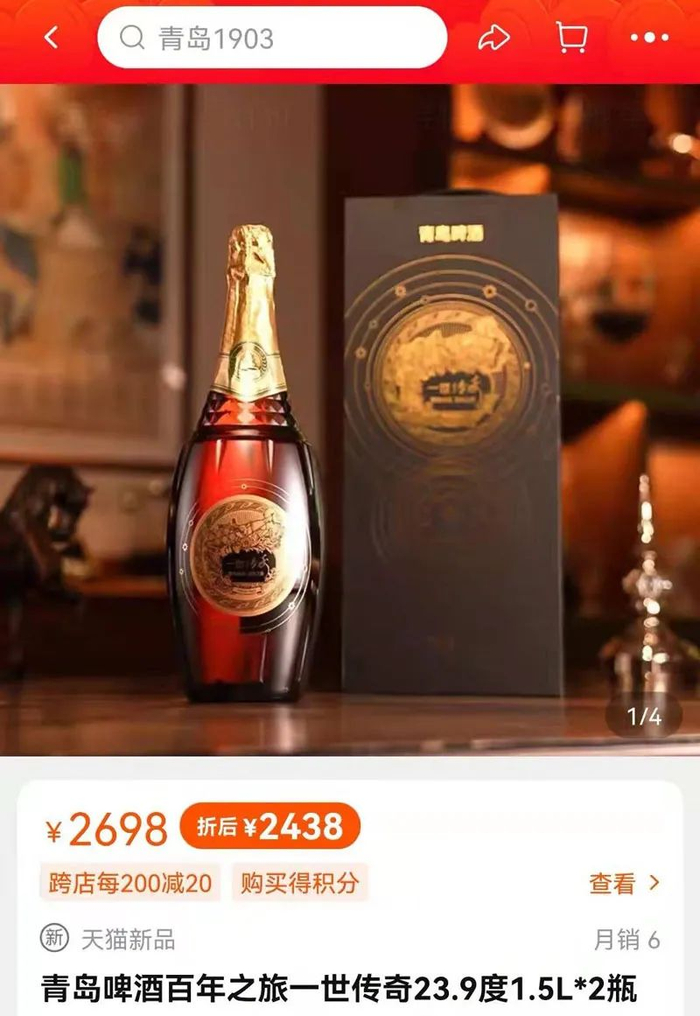 近日,青岛啤酒推出超高端新品“一世传奇”,电商平台显示售价为2698元/1.5L*2瓶。
