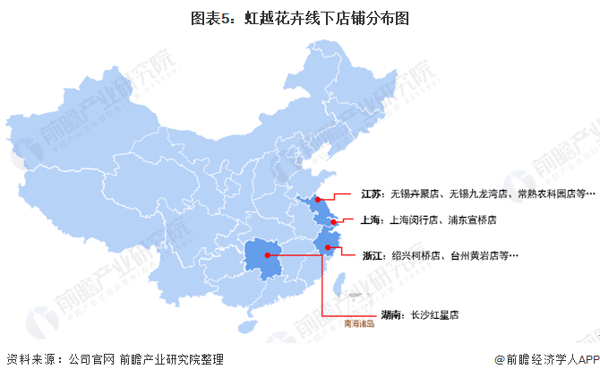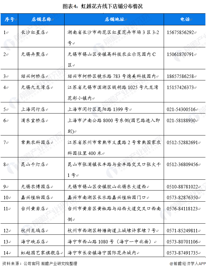 截至2021年年末,虹越花卉共计拥有14家线下店铺,从其线下店铺的分布来看,所有店铺均分布于长三角地区。
