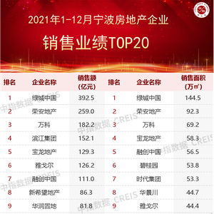 数据声明:房地产项目销售数据统计是以2021年1月1日-12月31日期间商品住宅销售额为统计口径,主要依据中指数据CREIS(点击试用)在宁波市域范围的销售监测数据,对于监测不全的项目数据,由企业提供相关文件并审核,也纳入统计范围。本报告仅供参考,不对使用报告及其内容所引发的任何直接或间接损失承担责任。