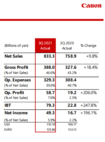 根据佳能集团发布的2021三季度财报数据,2021年第三季度集团营业额为8333亿日元,同比增长了9.8%;实现毛利3880亿日元,同比增长了18.4%,净收入则同比暴增了196.1%。