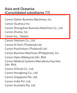 根据佳能此前公布的全球子公司数据,截至2020年底,佳能在国内的公司除了珠海,还在大连、苏州、中山、台湾地区设有公司。