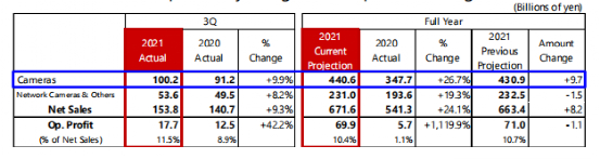 在网络摄像机方面,受到疫情影响,在原有防范与灾害监控等需求之外,如远距离监测以及掌握人群密集度等多样化用途增加,相关销售活动得到进一步强化,佳能预计全年销售将获得19%的增长。