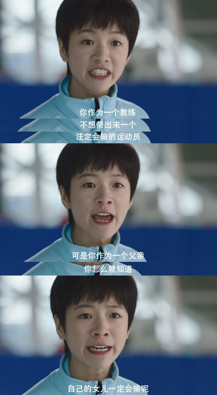 叙事的张力主要来自于父女的冲突。父亲一直不看好陈冕,在得知陈冕进入青岛队后,也进行制止和打压。父亲看到的是陈冕在队内赛排名最后,陈冕看到的是自己第一次在冰上顺利完成比赛。她对父亲喊道:这一场比赛虽然输了,她依然很开心,因为她终于可以和大家一起完成一场比赛。她喜欢滑冰,但从小到大都没有机会。她站在冰上就不停告诉自己不可以摔倒,下一次弯都要滑得更好。她做到了。她现在虽然能力不足,但她很享受这种不断超越自己的过程。