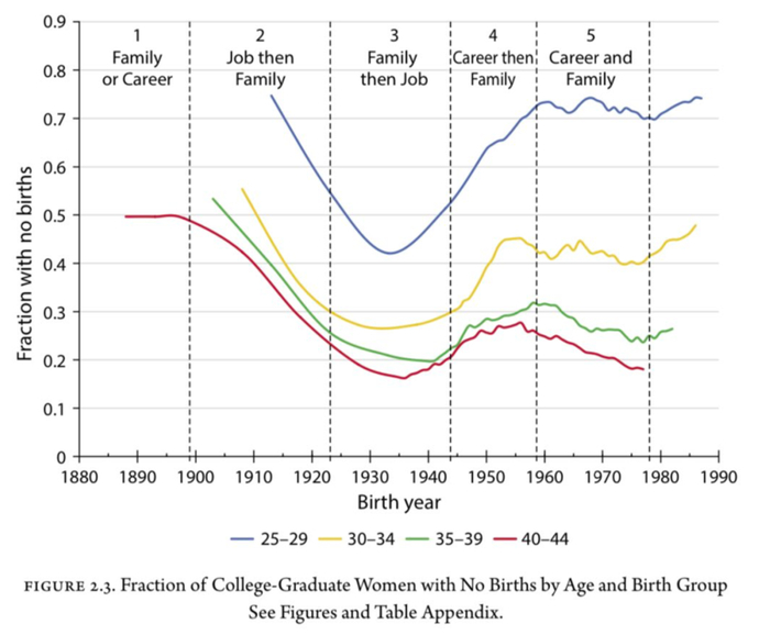 Goldin 按照“家庭”和“职业”在女性生命周期中扮演的角色[1] ,把不同年代拥有本科学历的女性分为五组。最早的一组女性出生于十九世纪末(美国刚有普查数据的时候),最晚的一组出生于上世纪八十年代初(更年轻的一代还没过生育年龄)。这五组人分别对应了“要么职业要么家庭”“工作然后家庭”“家庭然后工作”“职业然后家庭”“家庭和职业(同时发展)”。[2]