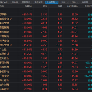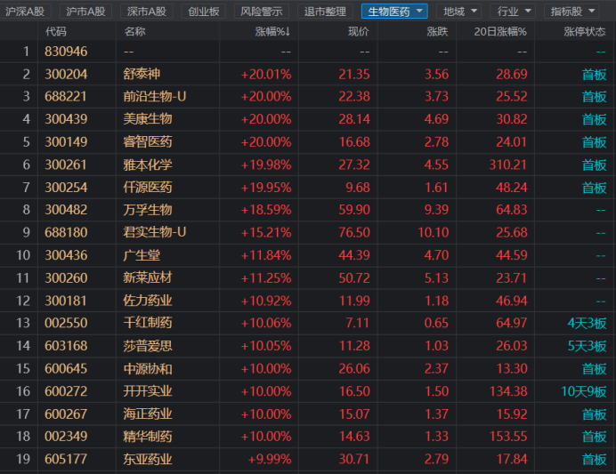 财联社(上海,编辑 梓隆)讯,今日(1月14日),生物制药板块大幅走强,个股也掀起涨停潮,截止收盘,舒泰神、前沿生物、美康生物、睿智医药、雅本化学、仟源医药20cm涨停,千红制药、莎普爱思、中源协和、开开实业、海正药业、精华制药、东亚药业涨停,此外,万孚生物涨近18.6%,君实生物涨近15%,广生堂、新莱应材、佐力药业涨逾10%。