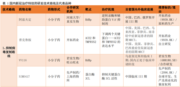 整体来看,新冠特效药市场前景广阔,核心受益标的方面,首创证券指出,现有在研新冠病毒的抗病毒治疗药物主要包括中和抗体药物和小分子药物,主要围绕抑制病毒复制、阻断病毒进入细胞、调节人体免疫系统3条技术路线,国内外临床试验正有序进展。新冠药物方面建议关注具有国内首个获批新冠抗体药物的腾盛博药,产品进度领先和临床效果优异的开拓药业,以及具有小分子和抗体双重布局的君实生物。