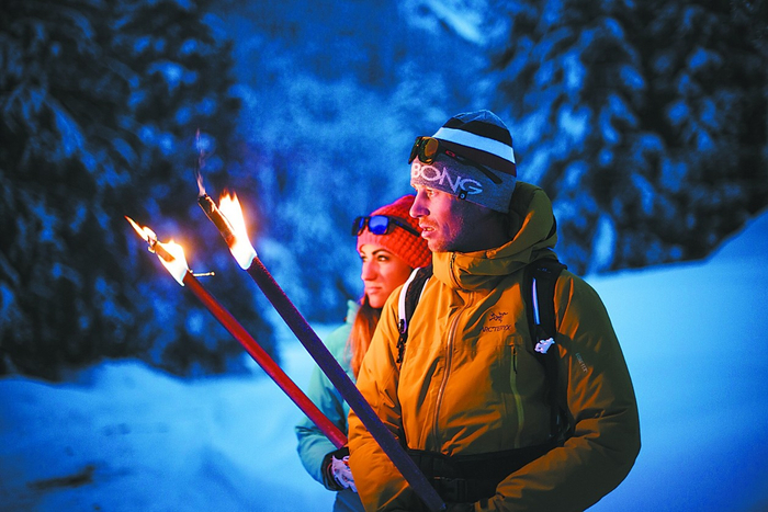奥地利皮勒湖山谷还有 “火把徒步”活动(如图)。夜幕降临后,游客手持点燃的火把,跟随经验丰富的女向导丽莎·弗拉舍尔沿着白茫茫的林间小路慢慢走进黑暗的森林。据弗拉舍尔介绍,夜晚徒步的过程好像一场回到过去的冒险,四周一片寂静,只有踩在脚下的雪嘎吱作响,间或听到来自自然界的声音,或在雪地里观察到动物的踪迹。在火焰带来的光明和温暖中,游客可以感知人类的祖先如何度过冬夜。