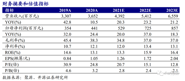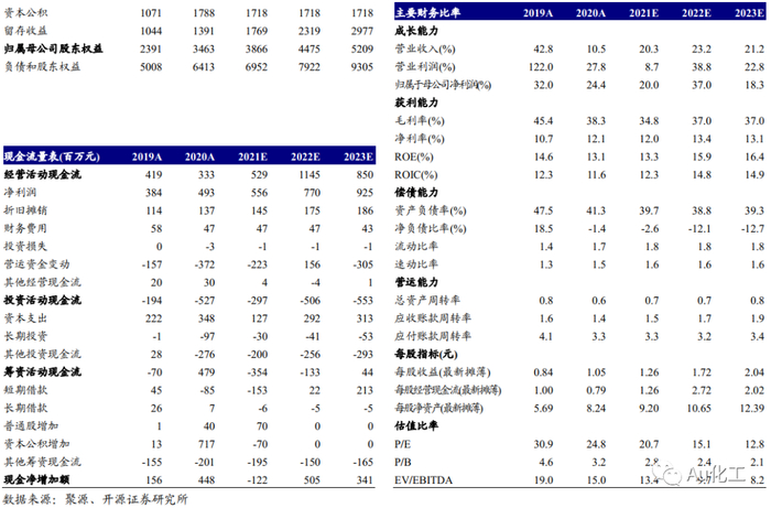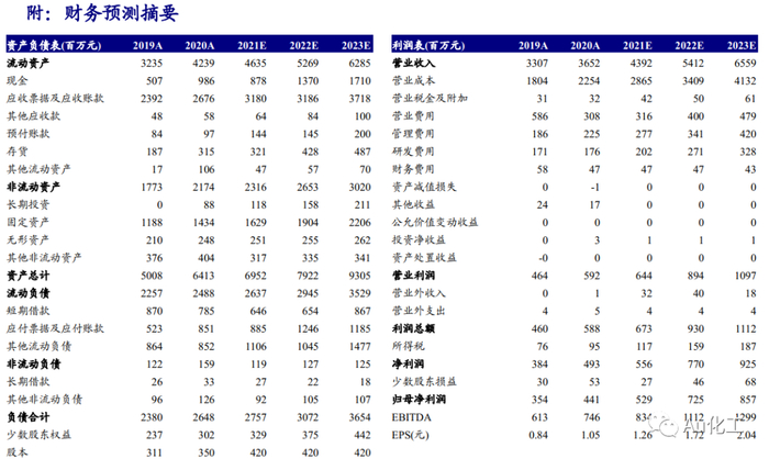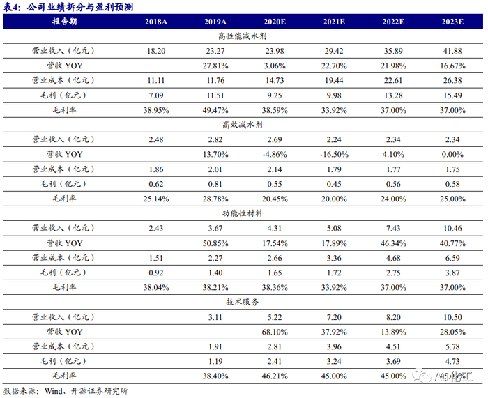 高性能减水剂:随公司广东江门基地等新基地产能逐步投放,公司销售半径进一步扩大,公司市场占有率进一步提升。我们假设公司2021-2023年营收增长分别为22.70%、21.98%、16.67%,假设公司2021-2023年毛利率分别为33.92%、37%、37%。