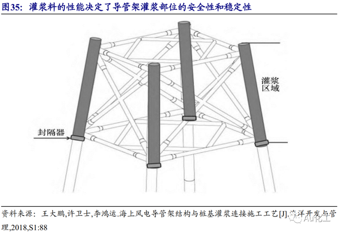 海上风电灌浆料对性能要求严苛,具有较高的技术壁垒,国产化也势在必行。风机基础灌浆料适用于陆地、潮间带及海上风电场风机、升压站等基础的灌浆和调平,同时也适用于其它有高强、高耐久要求的设备基础安装工程。根据论文《海上风电导管架灌浆原型试验研究》,海上风电导管架灌浆料需要具备低用水量、大流动性、高早强、超高强、微膨胀、高耐久等特点。灌浆料的性能决定了导管架灌浆部位的安全性和稳定性,风电机组的质量及受力情况决定灌浆料的性能要求。灌浆料对风电基础不仅起受力缓冲作用,同时也起提高结构安全性和稳定性的作用。由中交港湾研发的UHPG 系列海上风电导管架灌浆连接材料产品为均布超细颗粒致密体系水泥基材料,采用聚合物改性和纳米增强技术研发而成,产品是以特种水泥、超细矿物掺合料、纳米微粉和复合膨胀剂等组成的胶凝材料与优质天然高强石英砂、高性能减水剂、聚合物和其他各类化学改性剂组成的干混材料。根据论文《海上风电导管架结构与桩基灌浆连接施工工艺》,提到海上风机结构所受到的力极为复杂,包括风机叶片和风机自身旋转以及塔桶造成的风机载荷、波浪力、潮流力、船舶的撞击力等,这就决定了近海风电导管架基础的灌浆连接尤其重要,尤其是在灌浆材料的选择和灌浆质量的控制等方面的要求将更加严格。同时,国产灌浆料与国外进口产品相比,具备短距离运输、供货周期短、售后服务响应及时等优点,长期来看海上风电灌浆料国产化是必然趋势。