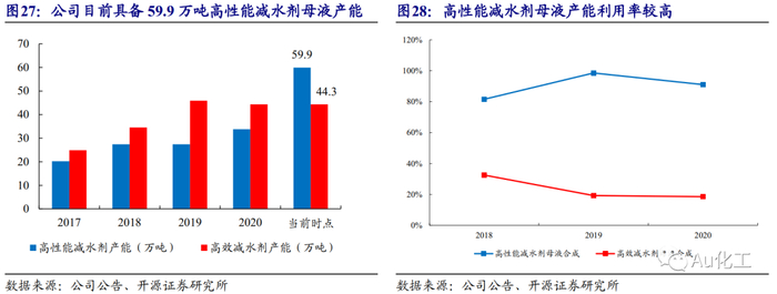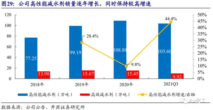 当前公司具备59.9万吨高性能减水剂母液产能,44.3万吨高效减水剂母液产能。根据公司公布的产能利用率,高性能减水剂母液的产能利用率近三年基本位于80%以上,高效减水剂产能利用率偏低,2019年和2020年分别为19.3%和18.6%,这主要是由于目前第三代聚羧酸高性能减水剂为主流减水剂,第二代萘系等高效减水剂正在被高性能减水剂逐步取代,导致产能释放不足。从公司成品销售上来看,公司上市至今,随着高性能减水剂产能扩张抢占市场份额,其销量增速也保持快速增长。2020年上半年,由于受到新冠疫情的冲击,公司产品销量增速放缓,但高性能减水剂的全年销量仍然微增9.8%;截至2021Q3销量增速同比大增44.4%,展现出一如既往的稳健和较强的抗风险能力。