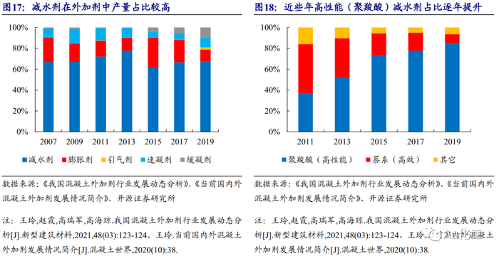 由于高性能聚羧酸减水剂减水效果突出,在各类减水剂中的占比逐年提升。2011年,聚羧酸减水剂仅占比37.1%,萘系减水剂是主流减水剂,占比高达46.9%。2013年,聚羧酸减水剂的应用比例大幅提升并反超萘系减水剂,聚羧酸减水剂占比上升至52.2%,萘系减水剂占比下滑至37.5%。此后聚羧酸减水剂占比继续保持上升趋势,截至2019年,其占比已经上升至84.4%,萘系减水剂占比下降至9.1%。目前高性能聚羧酸减水剂已经成为市面上的主流减水剂。