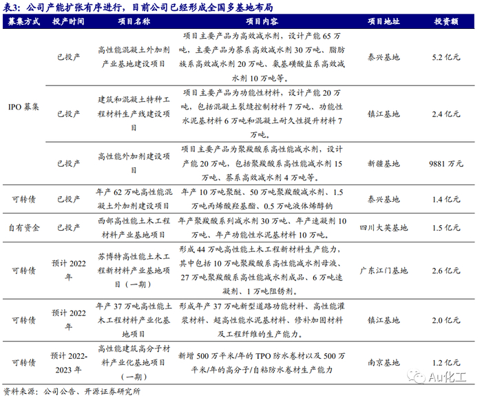 公司产能扩张有序,多基地规划和布局持续兑现,助推公司销售覆盖范围持续扩大。目前公司拥有江苏(南京、泰兴、镇江)、天津、四川大英、新疆等多基地布局,其中,在南京、泰兴基地拥有聚醚合成产能,其余基地具备减水剂母液和复配产能,镇江基地以功能性材料产品为主。当前,公司生产基地已经遍布华东、华北、西南、西北,助力公司抢占市场份额。2021年1月,公司发布公告将于广东江门投建苏博特高性能土木工程新材料产业基地项目,项目预计总投资人民币5亿元;根据公司2021年12月27日发布的《公开发行可转换公司债券募集资金使用的可行性分析报告(修订稿)》公告,项目一期将先行投入2.6亿元,用于建设10万吨聚羧酸高性能减水剂母液、27万吨聚羧酸系高性能减水剂成品、6万吨速凝剂、1万吨阻锈剂。目前该项目正在如火如荼的建设中,根据项目建设进度,我们预计将于2022年投产,公司将凭借该项目进一步打开华南市场。此外,《公开发行可转换公司债券募集资金使用的可行性分析报告(修订稿)》中提及,将投资1.98亿用于建设年产37万吨高性能土木工程材料产业化基地项目,根据项目建设进度,我们预计将于2022年投产。2021年9月,公司再度发布公告,将于连云港徐圩新区投资建设年产80万吨建筑用化学功能性新材料项目,项目预计总投资13.8亿元,预计项目将包括聚醚合成产能,有力支撑公司下游减水剂的扩张计划,根据建设周期我们预计将于2023-2024年拉开投产序幕。