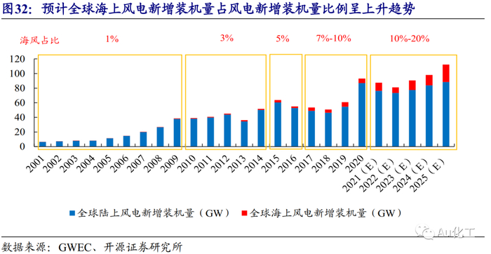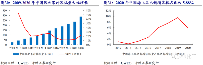 碳中和背景下,海上风电、平价并网推动风电景气向上。风力发电是依靠风力发电机,将风的动能转化为机械动能,再进而转化为电力动能。风电作为主要清洁能源的一种,近十年来持续发展,据GWEC,2009-2020年中国风电累计装机量从25.81GW增长到288.32GW。风电可分为海上风电和陆上风电,海上风电是指在沿海多年平均大潮高潮线以下海域或相关海域内无居民海岛上的风电开发,据GWEC,2020年国内海上风电新增装机占总新增装机比例为5.88%。海上风电虽然发展较晚,但具有节约土地资源、风能资源丰富、规模集群效应显著、发电状态稳定等优势,未来潜力可期。GWEC预计2020-2025年全球陆上/海上风电新增装机量CAGR分别为0.32%/31.41%,预计2025年全球海上风电新增装机量占比将达21.30%,从整体规模来看,陆上风电将呈稳定增长、海上风电呈快速增长。