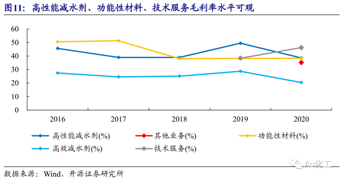 高效减水剂:由于目前市场主流减水剂为高性能减水剂,高效减水剂应用范围基本稳定或将继续收缩。我们假设高效减水剂营收增速保持平稳,2021-2023年毛利率水平分别为20%、24%、25%。