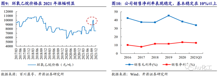 根据公司公告和Wind数据,公司销售毛利率基本围绕38%上下波动,2019年,三大原材料环氧乙烷、甲醛和工业萘的价格整体大幅下降,原料成本下降明显,加之营业收入大幅增长,销售毛利率高达45.44%。进入2020年后,受疫情影响,公司营收增速有所放缓,且公司实行新收入准则,将销售运费重分类至成本,毛利率回落。2021年,原料环氧乙烷、甲醛价格涨幅明显,尤其进入三季度以来,环氧乙烷急速拉涨,公司毛利率承压、出现下滑。截至2021年前三季度,公司的销售毛利率为33.92%,处于历史较低水平。分产品来看,高性能减水剂毛利率随原料成本波动较大,截至2020年为38.59%;功能性材料毛利率近三年基本稳定在38%左右;技术服务毛利率水平较为可观,2020年高达46.21%;高效减水剂是二代(上一代)减水剂产品,毛利率水平较低,围绕着25%左右波动。公司销售净利率表现稳定,基本稳定在10%以上。