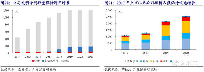 公司研发团队以缪昌文院士和刘加平院士领衔,公司强劲的研发实力以及高学历占比的人员结构是公司内生增长的坚实基础。公司在2011-2021年这十年间先后涌现了缪昌文和刘加平两位中国工程院院士,同时还培养了国家杰出青年基金获得者、国家 “万人计划”领军人才冉千平教授,足以彰显公司深厚的研发实力。同时,公司的“高性能土木工程材料国家重点实验室”是行业内唯一国家级重点实验室,董事长缪昌文院士分任国家重点实验室副主任和协同创新中心主任。公司作为国内混凝土外加剂龙头,一如既往地保持优秀的发明创新能力。公司在2014-2021年期间累计取得的专利数量保持增长,2019年公司发明专利累计数量(含公开、实质性审查和授权)突破1200个,展现出持久的研发动能。公司持续强化人才培养机制,高学历人才占比逐年上升。自上市以来,公司本硕博员工数量逐年攀升,2017年公司本硕博员工数量占比仅为39%,2020年公司本硕博员工数量已经上升至近50%,其中博士数量从2017年的17人上升至2020年的29人。此外,2019-2020年,公司研发人员的数量基本保持在270人左右,占比超10%。高端研发人才的引进有助于公司建立行业领先的科技创新体系,源源不断地提升和巩固公司研发实力,为公司内生动力提供有力支撑。
