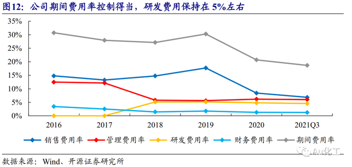 公司期间费用率控制得当,研发费用保持在5%左右。2020年公司实行新收入准则,将销售运费重分类至成本,公司期间费用率和销售费用率下降明显。公司坚持一如既往的研发投入,2018年起研发费用率基本保持在5%左右。公司财务费用率逐步降低,从2017年刚上市的2.54%震荡下降至2021Q3的1.26%。