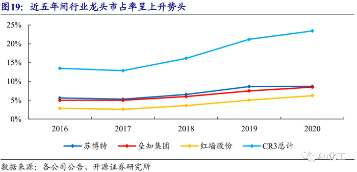 混凝土外加剂(减水剂)行业集中度十分分散,近5年间龙头市占率呈现上升趋势,继续看好龙头市占率持续提升。由于外加剂产量中65%左右或以上为减水剂,因此外加剂的市场占有率基本可以反映减水剂的市场占有率情况。根据苏博特、垒知集团、红墙股份2016-2020年年报和经营数据,我们以销量计算,可推算出在2016年外加剂行业CR3仅为13.5%左右,其中苏博特占比为5.6%,垒知集团占比为5%,红墙股份占比为2.9%。截至2020年,CR3占比已经提升至23.4%,苏博特的占有率已经提升至8.7%,垒知集团提升至8.5%,红墙股份提升至6.2%。在这5年间三大龙头市占率的上升趋势明显,这主要得益于龙头凭借资金优势和技术优势进行产能规模的日益扩张和销售市场的不断开拓。我们认为,当前外加剂(减水剂)行业集中度仍然较为分散,目前尚处于向龙头集中的发展阶段,我们继续看好以苏博特为代表的龙头企业将持续抢占市场份额。