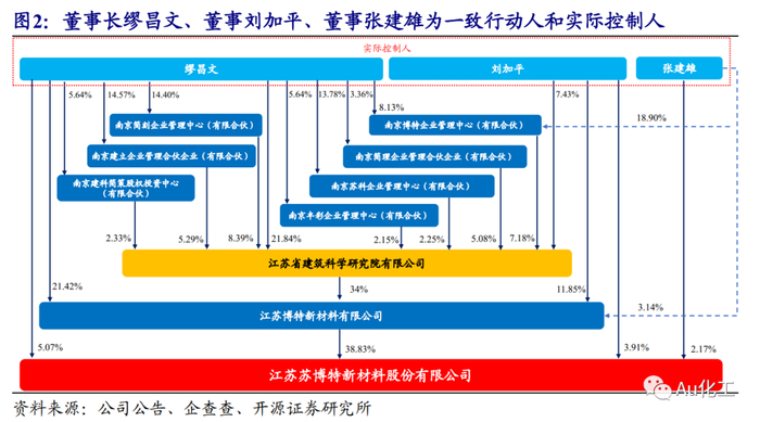 公司董事长缪昌文院士、董事刘加平院士、董事张建雄先生为一致行动人和实际控制人。公司第一大股东为江苏博特新材料有限公司,截至2021年三季报,其持股比例为38.83%,公司董事长缪昌文直接持股5.07%,刘加平直接持股3.91%,张建雄直接持股2.17%,以上三人为一致行动人和实际控制人。同时,以上三人还通过江苏博特新材料有限公司、江苏省建筑科学研究院有限公司、多个有限合伙企业间接持股公司。根据企查查和公司公告可计算出,缪昌文共计持股公司16.76%,刘加平共计持股9.49%,张建雄共计持股3.57%,三人合计控制公司29.82%的股份。