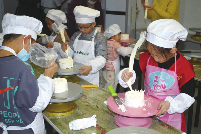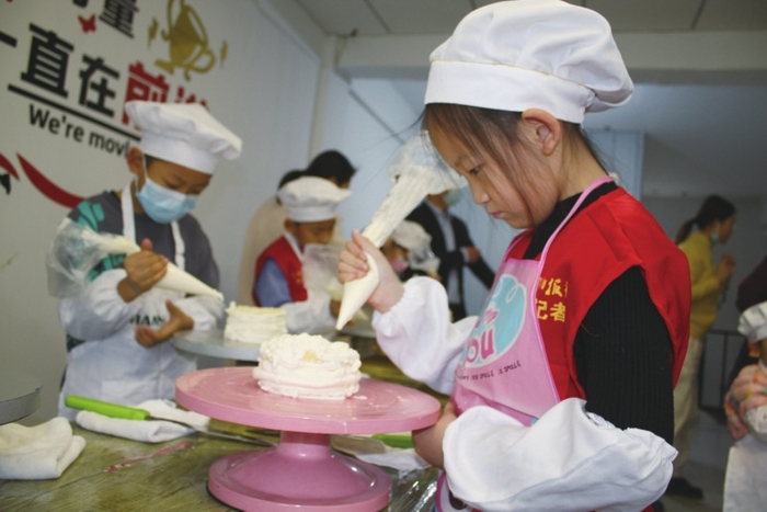 穿戴好“装备”后,小记者们围着准备好的蛋糕坯,耐心地听烘培师讲解蛋糕的制作过程。“想学做蛋糕,请同学们先看我给大家演示奶油蛋糕的制作步骤。用你们手中的抹刀把奶油均匀抹在蛋糕坯上,要有耐心,注意安全!”看着有些迫不及待的小记者们,糕点师耐心地进行着示范动作。