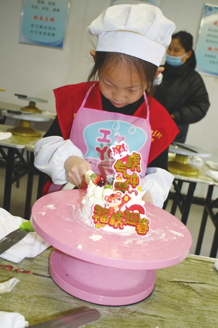 制作过程中,面对那诱人的奶油,小记者们早已按耐不住,将多余的奶油偷偷放到嘴里品尝品尝。做好蛋糕坯后,“小烘焙师”们发挥着各自的天马行空的想像,将葡萄、弥猴桃、火龙果、黄桃等水果点缀在蛋糕上,创意出各种造型的水果拼图。同时,为迎接2022年的到来,小记者们还将蛋糕店准备的“福虎迎春、虎气冲天”的迎新年卡片装饰在蛋糕上,营造浓浓的节日氛围。