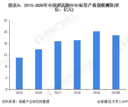 根据爱采购网来看,目前超高频RFID标签价格在0.2-2元之间不等,通用标签价格较低,从应用量最大的服装标签来看,目前价格在0.45元/个左右。以0.45元/个的超高频RFID标签价格来测算,2020年中国超高频RFID标签市场规模约为19亿元。
