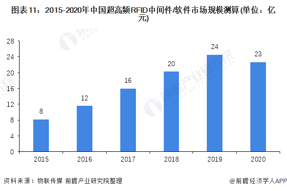 中间件是扮演RFID标签和应用程序之间的“中间介质”。中间件是位于平台(硬件和操作系统)和应用之间的通用服务,这些服务具有标准的程序接口和协议。针对不同的操作系统和硬件平台,它们可以有符合接口和协议规范的多种实现解决分布异构问题。2020年,受疫情影响,中国超高频RFID总体产值下滑6%。根据物联传媒披露的数据,2020年中国超高频RFID中间件/软件市场规模为23亿元。