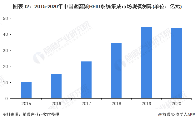 从产业链几个环节的发展来看,国内的系统集成是发展最快的环节。由于超高频RFID产品绝大多数是以系统级应用的形式被应用到各行业中去,因此,在中国超高频RFID产业链中系统集成占有优势地位。从早期的门禁、安防系统,到现在的供应链管理、生产线管理等应用,RFID系统集成的覆盖面越来越广,正逐渐渗透到各个领域。鉴于系统集成非制造业,受疫情影响较小,初步测算2020年中国超高频RFID系统集成市场规模为44亿元,与2019年基本持平,预计未来系统集成市场规模将会有较快的增长。