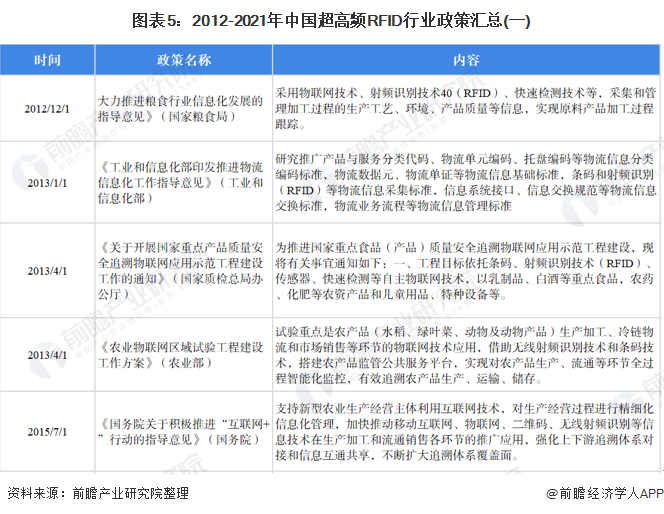 射频识别(RFID)产业是国家优先发展的产业之一。2012年开始,我国工信部、农业部、商务部、财政部等部门都出台政策推动和规范超高频RFID行业的发展。