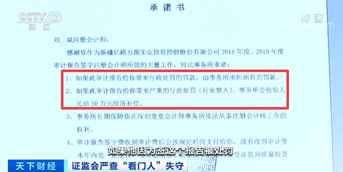 据调查人员介绍,在会计师拒绝签字且离职的情况下,堂堂会计师事务所又临时引入一名新的会计师刘某斌,这名临时引入的会计师从入职到签署且出具上市公司审计报告仅用了不到三天。并且这名新会计师担心签署报告后受到行政处罚,所以堂堂会计师事务所给他出具了“承诺书”:称如果刘某斌被处罚,由堂堂会计师事务所承担处罚责任,如果严重,还会补偿给刘某斌30万元。