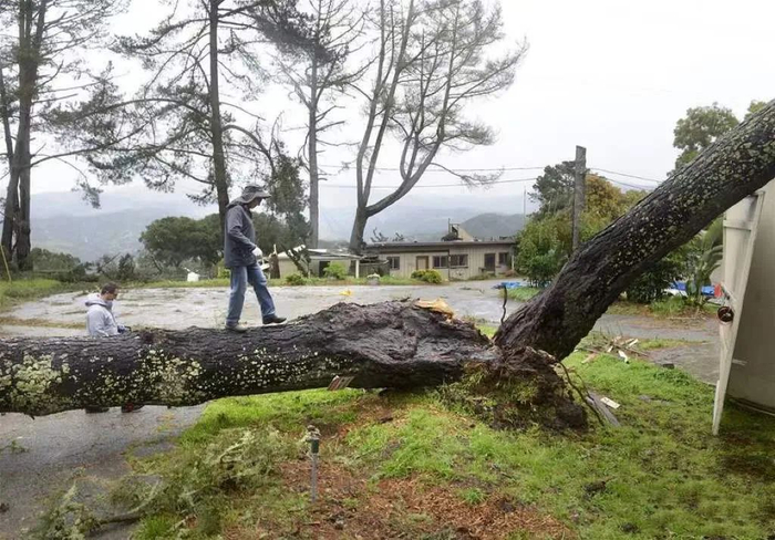 2021年2月17日,美国加州南部受大气河影响,遭遇6年来最强暴风雨袭击。图为杜阿尔特市市民查看暴风雨过后倒下的大树