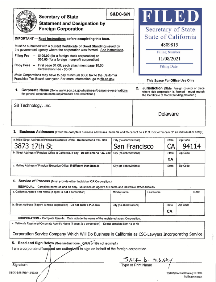 早在2021年11月,他就为一家SB Technology, Inc (SB技术公司)签署了一份加州监管文件,该公司将在加州开展业务,总部设于旧金山。最近几周,一个与该公司有关的网站sandboxquantum.com出现。但截至目前,该网站没有发布任何信息。