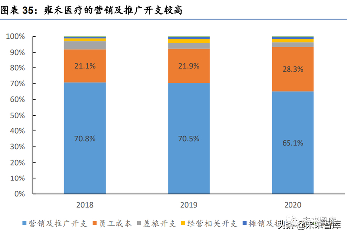 目前植发行业仍属于渗透率较低,发展速度较快的阶段,行业内尚未出现龙头领 导者。因此各大植发机构均投入较高的营销费用,以占领消费者心智、扩大市场影响 力并抢占市场份额。以雍禾为例,2018 至 2020 年,销售和营销开支占总收入的比 重分别为 49.6%、53.1%与 47.6%,而用在宣传推广上的费用分别占据销售营销开支 的 70.8%、70.5%与 65.1%。
