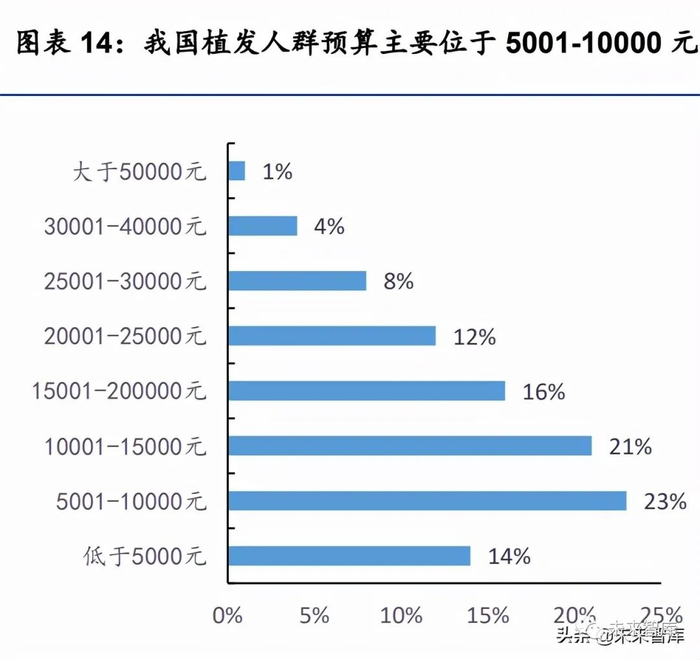 植发手术费用一般根据需要种植的毛囊单位数量计算。根据艾瑞咨询的数据, 2018 年我国的植发人群平均花费为 17868 元,其中功能性植发人群的花费最高,为 21444 元。植发人群的预算大多集中在 5001-15000 元的区间。总体来看,植发的客 单价较高。由于植发手术通常为一次性的,若后期植发效果较好,不需要进行二次手 术,因此,植发的客户粘性较低。