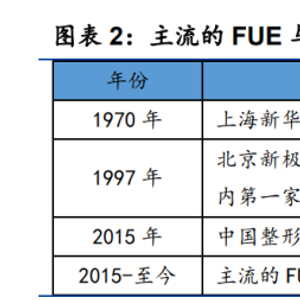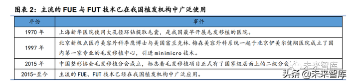 技术进步是推动植发行业发展的重要因素,且目前的植发技术已经处于成熟阶 段。从 1800 年 Baronio 开展毛发移植的动物实验,到 1959 年 Norman Orentreich 提出“毛发移植供区优势”理论,再到今日具备成熟技术的 FUE 与 FUT,植发行业 已经历经将近 200 年的发展,所用的器械逐渐精细化,手术逐步微创无痕化,消费者 的体验感逐步变好,植发的效果越来越自然美观。