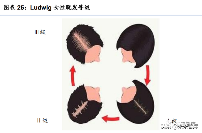 女性 AGA 脱发的特点是冠状区毛发弥漫性减少,前额发际线保持完整。Ⅰ级患 者冠状区前面头发变薄,需改变发型以掩盖前额顶部的头发变薄,发际线完整,不需 要植发;Ⅱ级冠状区毛发更明显地变薄,受累区域扩大、短发数目增加,不能以发型 掩饰,需要植发手术,例如发缝加密种植;Ⅲ级顶部几乎完全脱发或头皮裸露,前额 发际线仍然保持完整,患者不必拨开头发即能看见头皮,需要进行植发手术。