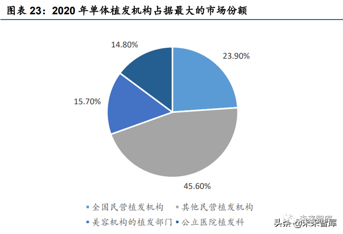 植发行业竞争格局较为分散,单体植发机构的市场份额较高。我国提供植发医疗 服务的机构主要分为四类:1)公立医院开设植发的整形美容科,占据 14.8%的市场 份额;2)类似雍禾、大麦微针的全国性民营医疗连锁机构,占据 23.9%的市场份额;3)美容机构的植发部门,占据 15.7%的市场份额;4)其他植发机构,即单体植发机 构,占据 45.6%的市场份额。(报告来源:未来智库)