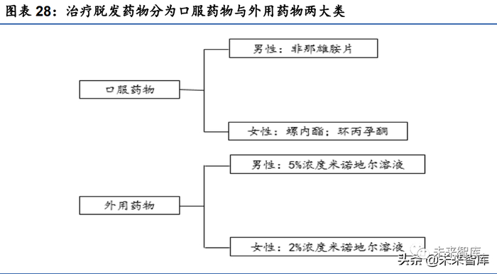 口服药物分为男性用药与女性用药。男性口服用药为雄激素阻断剂:非那雄胺片, 需连服 6 个月至 1 年或以上,此药为 5-αⅡ型还原酶的特异性抑制剂,能明显降低 DHT(二氢睾酮)浓度,控制脱发;其副作用是性欲降低,阳痿,射精量减少或有睾 丸疼痛等。女性口服用药为雄激素受体抑制剂:1)螺内酯,一般用药半年,其副作 用是性欲下降,乳房胀痛,月经紊乱;2)环丙孕酮,例如英达-35,一般连服半年, 其副作用是性欲下降,体重增加等。