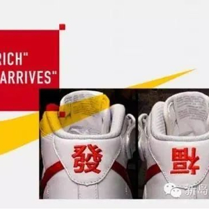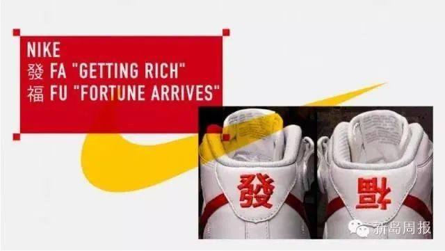 比如,Nike 曾发布一双春节特别版运动鞋。左脚后跟上缝制了一个 " 發 " 字,寓意为 " 发财 ",右脚后跟上缝制了一个倒写的 " 福 " 字,寓意为 " 福到 ",看起来还不错。