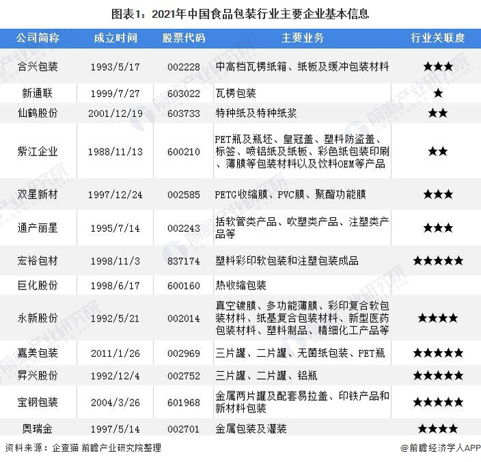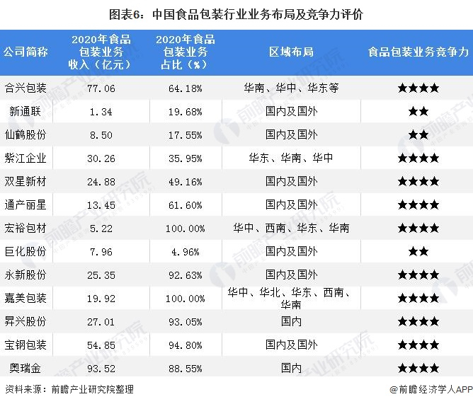 在中国食品包装行业企业中,龙头企业奥瑞金、紫江企业、双星新材、宝钢包装等,包装业务规模较大,产业布局较广,竞争力强劲。