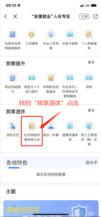 点击“浙里就业人社专区”进入,找到“我享退休”菜单,点击“社保待遇领取资格认证”