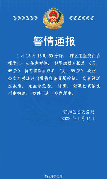 1月14日晚,武汉市公安局江岸区分局微博@平安江岸发布警情通报称,1月13日13时50分许,辖区某医院门诊楼发生一起伤害案件,犯罪嫌疑人张某 (男,48岁) 持刀将医生彭某(男,58岁) 砍伤。公安机关迅速出警将张某现场控制。伤者经送医救治,无生命危险。目前,张某已被依法刑事拘留。案件正进一步办理中。